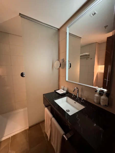 Les chambres comprennent une salle de bain privative, une douche, des articles de toilette, du linge de bain, un sèche-cheveux, du thé et du café, ainsi qu’un environnement pensé pour le repos rapide entre deux vols. Le site officiel insiste aussi sur la qualité de la literie, les options d’oreillers, l’éclairage apaisant et les douches puissantes.