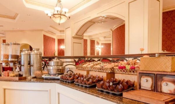 L’hôtel dispose de deux espaces de restauration principaux, Garden Court et Strikers Bar and Restaurant. Le site officiel mentionne aussi un service en chambre ainsi qu’un bar avec service autour de la piscine extérieure, Churchill’s Bar. L’ensemble donne à l’hôtel un profil de grand établissement complet, et pas seulement de simple adresse business.