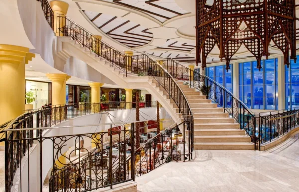 L’hôtel se situe au cœur des zones commerciales et administratives de Tripoli, avec un accès direct aux grands axes. L’ambiance intérieure mélange codes contemporains et inspirations arabes, avec de vastes espaces communs conçus pour recevoir, travailler et se détendre sans quitter l’établissement.