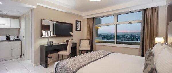 - 🛌 Studio Executive — 44 m² — 1 pièce — jusqu’à 2 personnes — lit king — kitchenette équipée — vue ville.