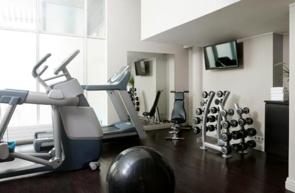Salle accessible à toute heure pour les clients, avec équipements cardio et musculation (tapis, rameur, elliptiques, poids, etc.), et un espace dédié aux étirements.
