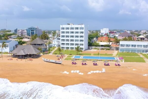 L’hôtel se trouve dans le secteur de Baguida Plage, un emplacement recherché pour son atmosphère plus calme que le centre-ville, tout en restant connecté aux grands axes de Lomé. Sur place, le décor met l’océan au centre, avec une vraie sensation de coupure dès l’arrivée.