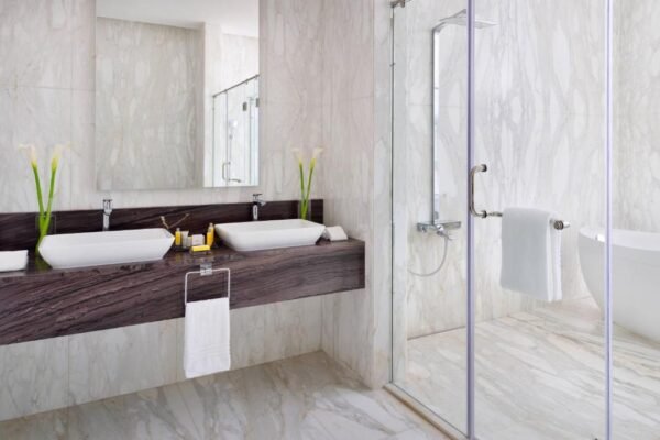 Les chambres et suites disposent de baies vitrées du sol au plafond, d’un espace de travail ergonomique, du Wi-Fi, d’une literie confortable, d’un mini-réfrigérateur, du service en chambre 24h/24 et d’une salle de bains avec baignoire profonde et douche pluie en marbre selon les catégories.