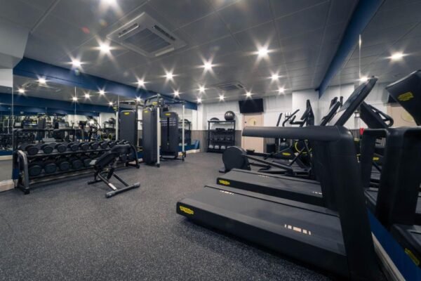 Salle de sport gratuite pour les clients, avec équipements cardio et musculation (rameurs, tapis, vélos, poids libres, etc.).