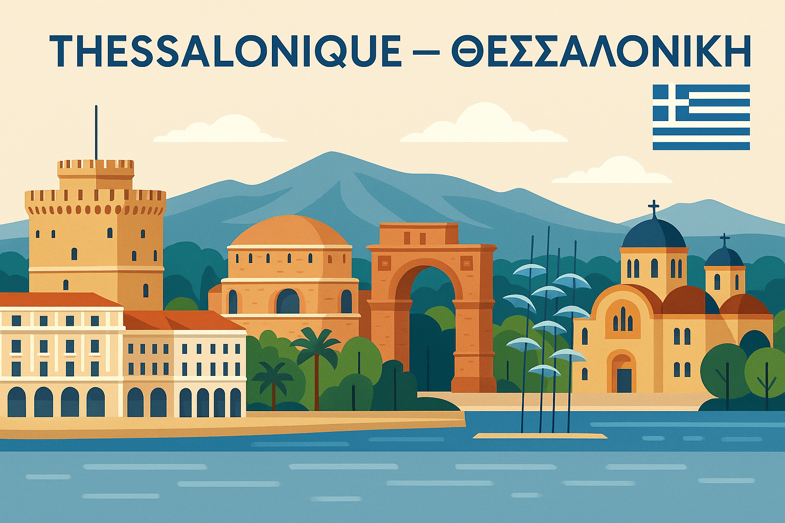 Au bord du golfe Thermaïque, Thessalonique mêle front de mer (Nea Paralia, Tour Blanche), marchés historiques (Kapani, Modiano), Ladadika animé, héritage romano-byzantin (Rotonde, Arc de Galère, églises UNESCO) et ruelles d’Ano Poli (ville haute) avec vues sur la baie. Climat méditerranéen : étés chauds/doux en soirée, automne/printemps idéaux. On visite à pied par quartiers, en bus OASTH, taxis/VTC et vélo le long du front de mer.